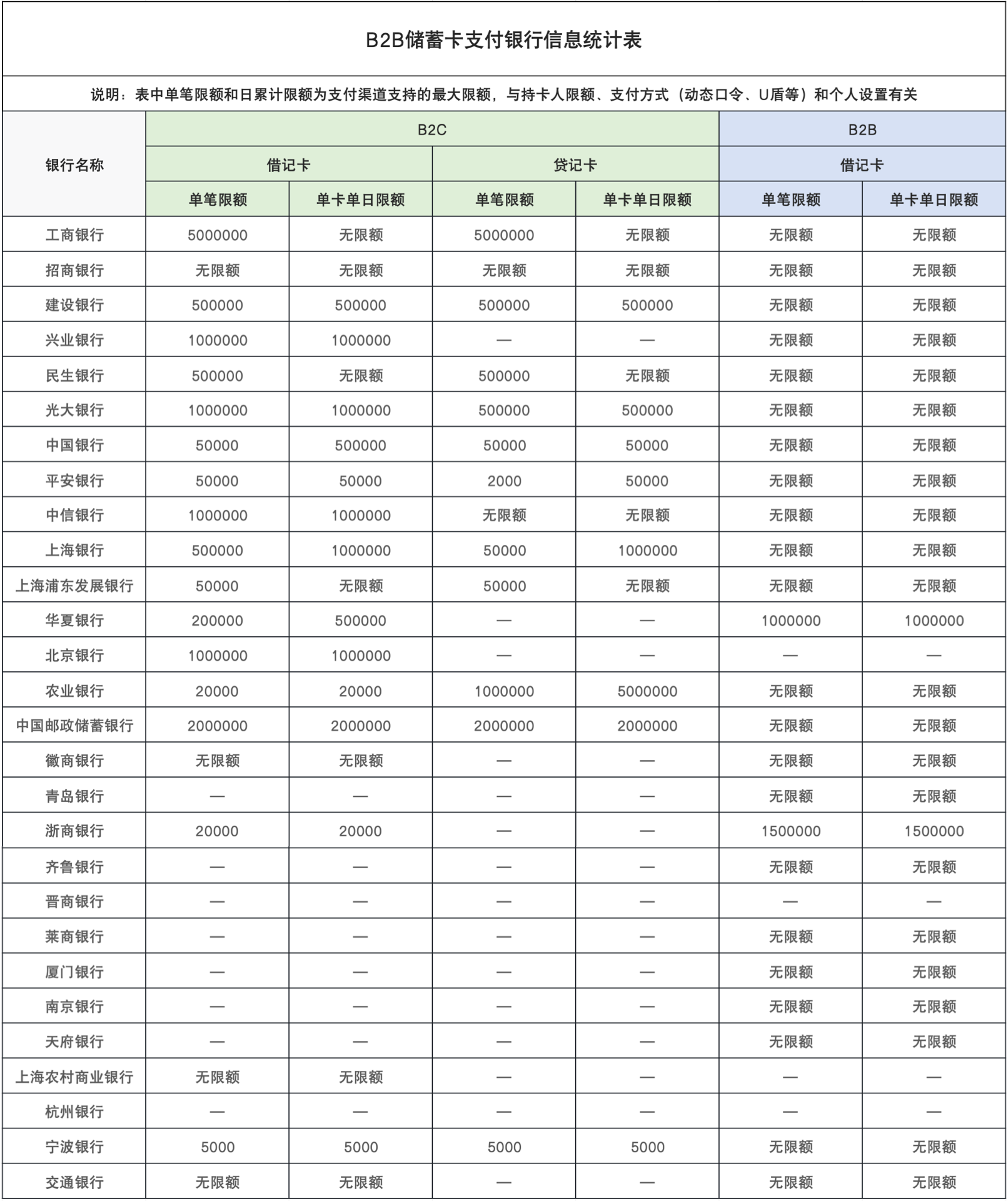 银行限额表